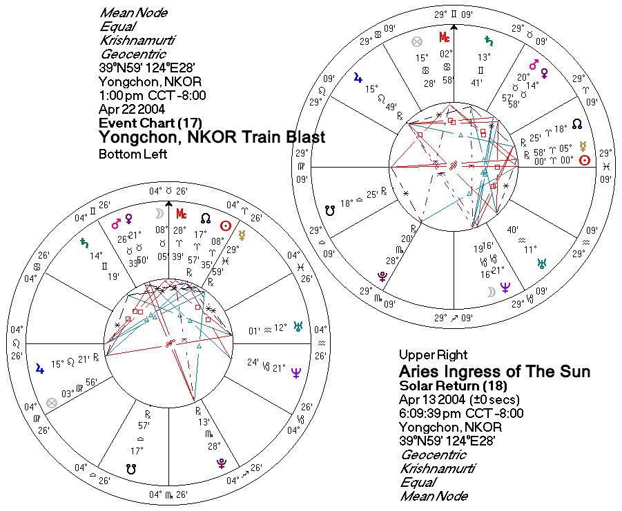 After hearing about the North Korean disaster, I relocated the Aries Ingress to Ryonchon (Yongchon). As in the earthquake charts, we find the same planets afflicting the angles in the two charts. The Ingress chart clearly suggests the nature of the event.